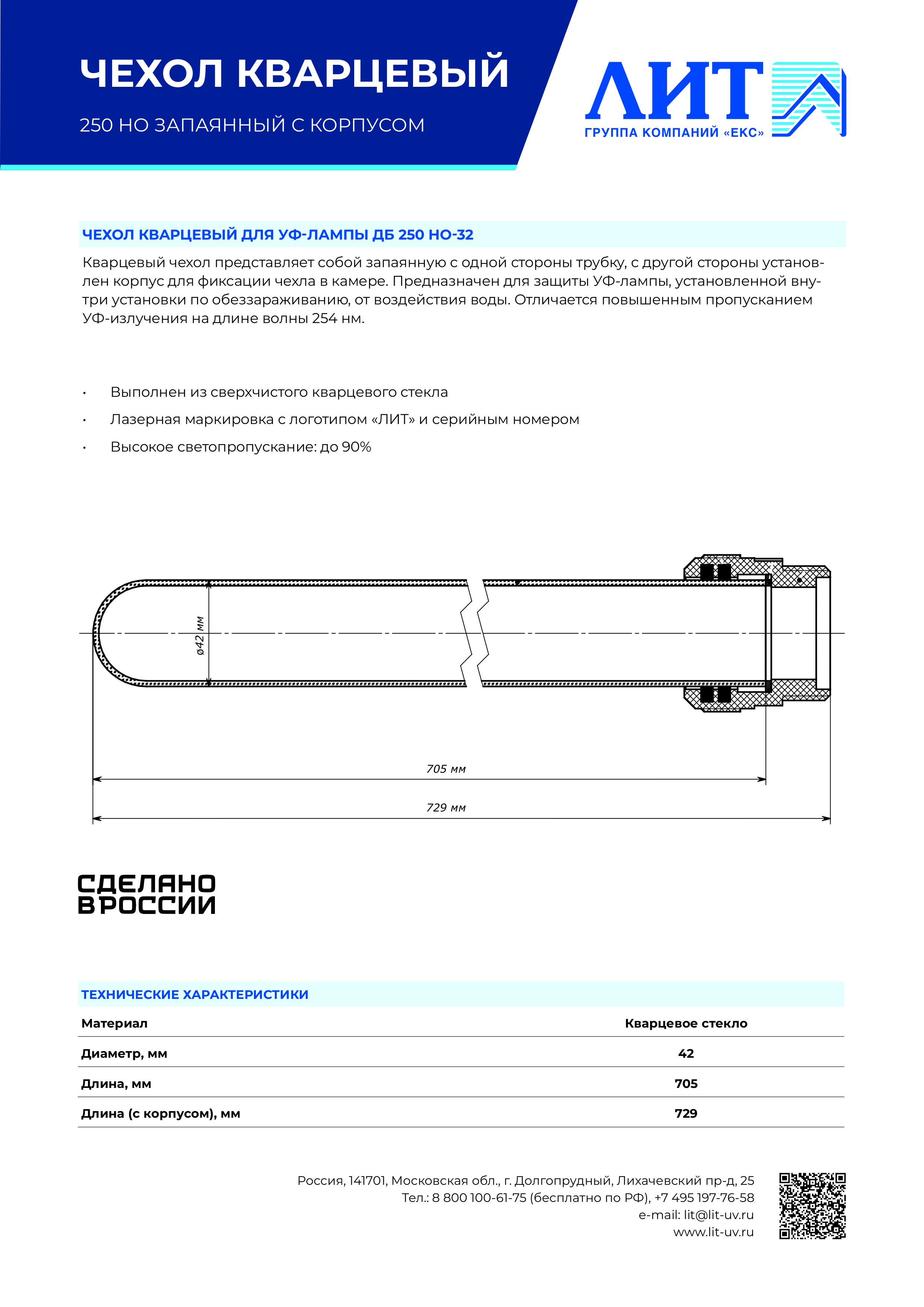 Кварцевый чехол представляет собой запаянную с одной стороны трубку, с другой стороны установлен корпус для фиксации чехла в камере. Предназначен для защиты УФ-лампы, установленной внутри установки по обеззараживанию, от воздействия воды. Отличается повышенным пропусканием УФ-излучения на длине волны 254 нм.